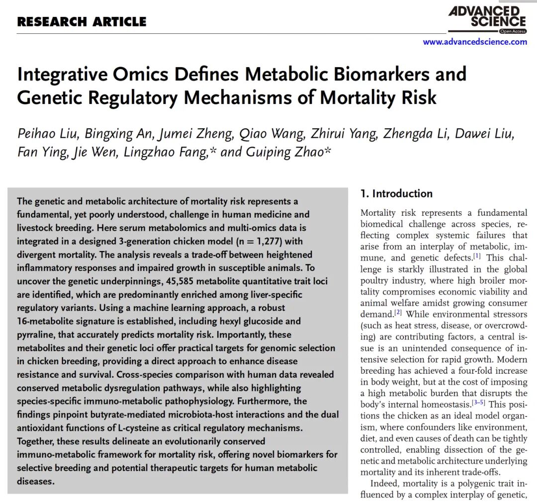 今天要解读的这篇发表于《Advanced Science》的佳作,来自中国农科院赵桂萍研究员和丹麦奥胡斯大学房灵昭教授的联合团队,正是打通物种壁垒、连接基础研究与育种/医学实践的典范。研究者们别出心裁地构建了一个多代鸡模型,通过巧妙的“同质死亡率”交配设计,成功分离出高、低死亡风险群体。随后,他们整合了全基因组重测序、血清代谢组、转录组(鸡GTEx)和肠道微生物组,开展了一场系统性的“侦探工作”: