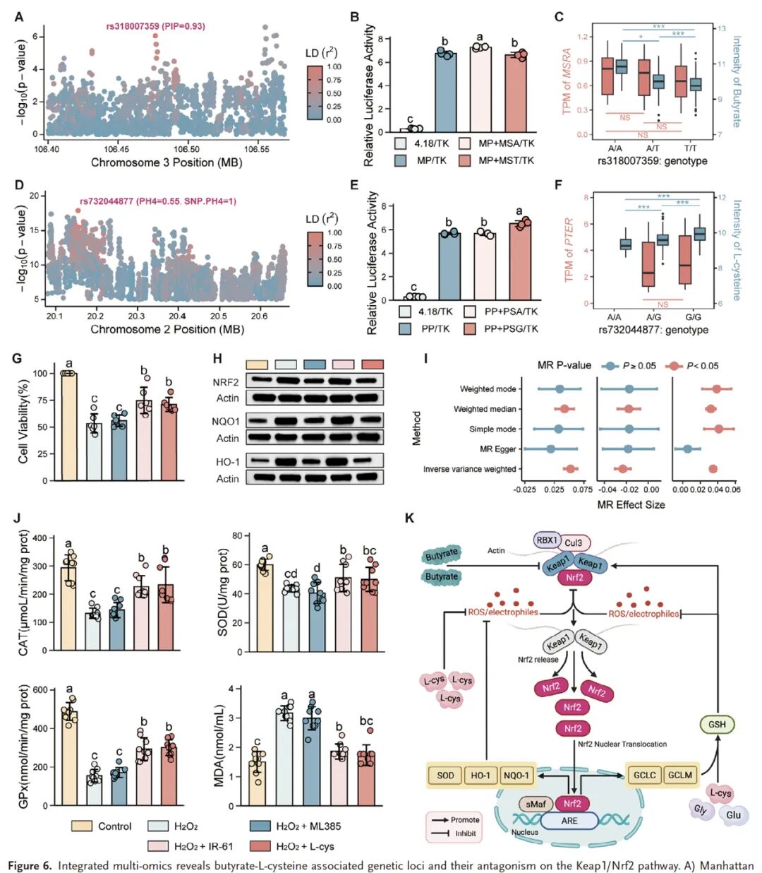 Figure 6. 整合多组学揭示丁酸盐与L-半胱氨酸的遗传位点及其在Keap1/Nrf2通路中的拮抗作用