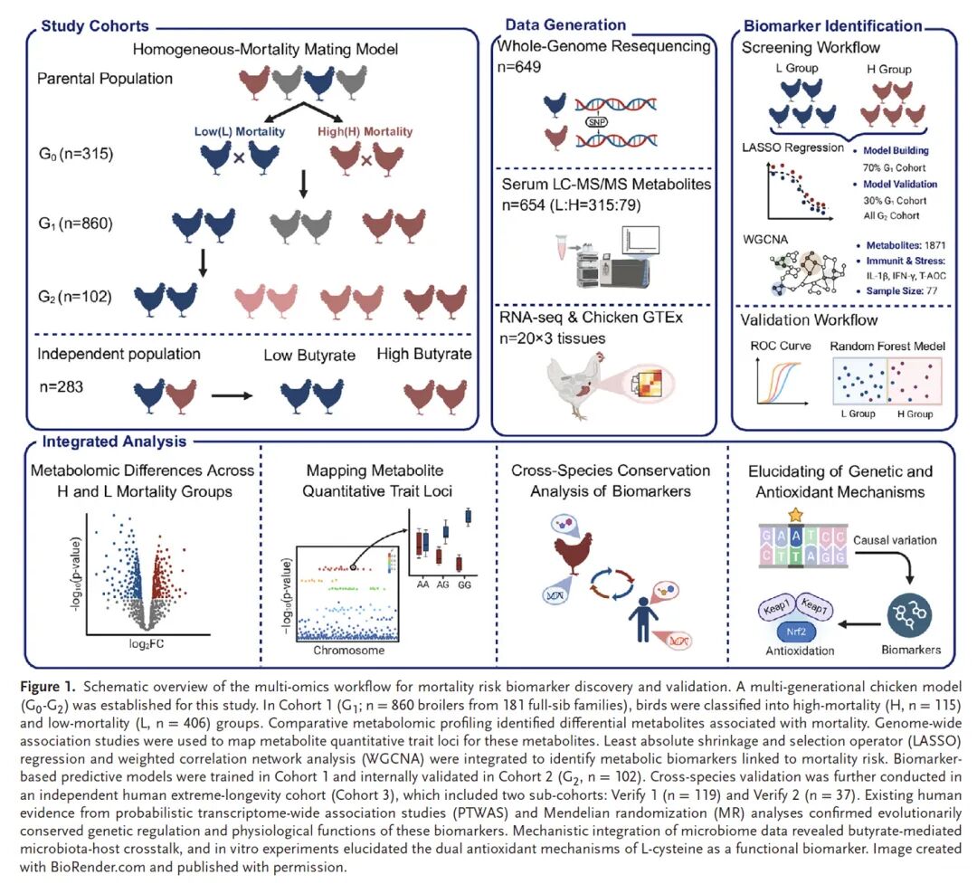 本研究采用多代鸡模型(G0-G2),通过死亡率驱动的同质交配设计,构建了高死亡率(H)与低死亡率(L)对比群体(Cohort 1)。整合血清代谢组学与全基因组关联分析(mGWAS),鉴定死亡率相关差异代谢物及其代谢数量性状位点(mQTL)。进一步融合LASSO回归与加权基因共表达网络分析(WGCNA),筛选核心生物标志物,并在内部验证队列(Cohort 2)与人类极端长寿队列(Cohort 3)中进行跨物种验证。通过孟德尔随机化(MR)、微生物组数据与体外实验,最终揭示了丁酸盐介导的微生物-宿主互作及L-半胱氨酸的双重抗氧化机制。