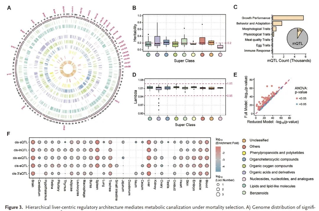 A) 与150个DAMs显著关联的mQTL在全基因组范围内的分布圈图。B) 不同代谢物超级类别的遗传力(h²)分布。C) mQTL与鸡复杂生产性状QTL的重叠数量,揭示了其多效性。D) 各代谢物GWAS的基因组膨胀因子(λ)。E) 比较仅含mQTL的简化模型与同时包含mQTL和死亡率分组的完整模型,评估生理状态对代谢变异的独立贡献。F) mQTL与鸡GTEx项目中各类分子QTL(molQTL) 的重叠分析,显示其在肝脏组织中高度富集,尤其是在cis-exQTL中。