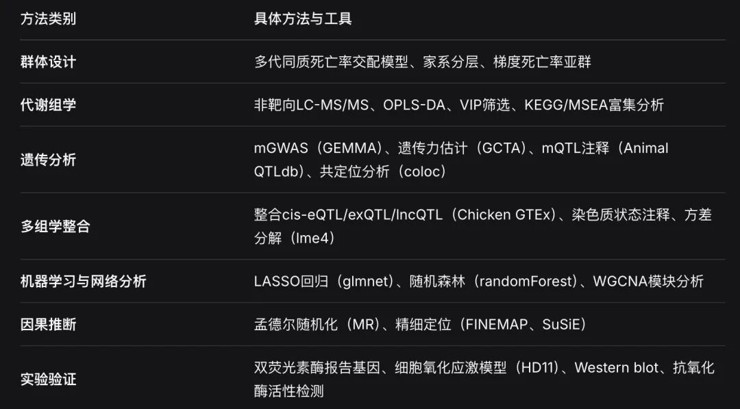 本研究通过多组学整合+机器学习+实验验证的系统性策略,揭示了鸡死亡风险的代谢与遗传基础,并成功将其拓展至人类疾病模型,为精准育种与人类代谢疾病研究提供了新的生物标志物与机制见解。