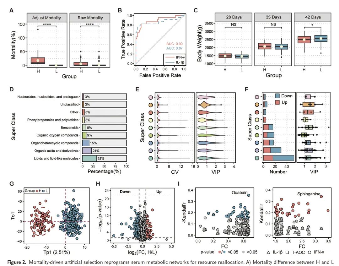 A) Cohort 1中H与L组间死亡率存在极显著差异。B) 细胞因子IL-1β与IFN-γ对死亡率风险展现出高诊断效能(ROC曲线)。C) L组在生长后期表现出显著的体重优势,揭示了免疫与生长之间的权衡。D-E) 代谢物的分类组成、变异系数(CV)与模型贡献度(VIP)分布。F-H) 差异积累代谢物(DAMs)在超级类别中的分布、OPLS-DA得分图及火山图,显示H与L组间显著的代谢分离。I) DAMs与炎症指标(IL-1β, IFN-γ)及总抗氧化能力(T-AOC)的相关性分析,揭示了促炎症代谢组特征。