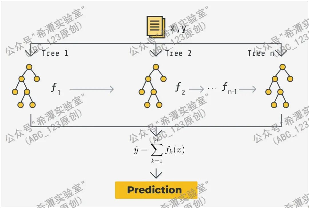 这个算法可能是目前处理表格和文本分类任务最强的算法之一,但对于这个算法,ABC_123 并未对其数学公式进行深入理解,早期学习卷积神经网络进行图像识别时,那些数学公式耗费大量精力,因此现在更关注这些模型在实际工作中如何调参使其效果更好。它与神经网络算法不同,不是一个逐步学习训练的大脑,也不像LSTM那样模拟人脑的阅读过程,而像是训练一个委员会。它由成百上千棵决策树组成,它的训练过程是迭代的:第1棵树预测错了哪些域名,第2棵树就专门去纠正这些错误,第3棵树再纠正前两棵树的错误......以此类推,误差在多轮迭代中不断被削弱。最后将这 1500 棵树的预测结果进行加权汇总,从而在 DGA 域名识别任务中获得高精度且稳定的预测效果。