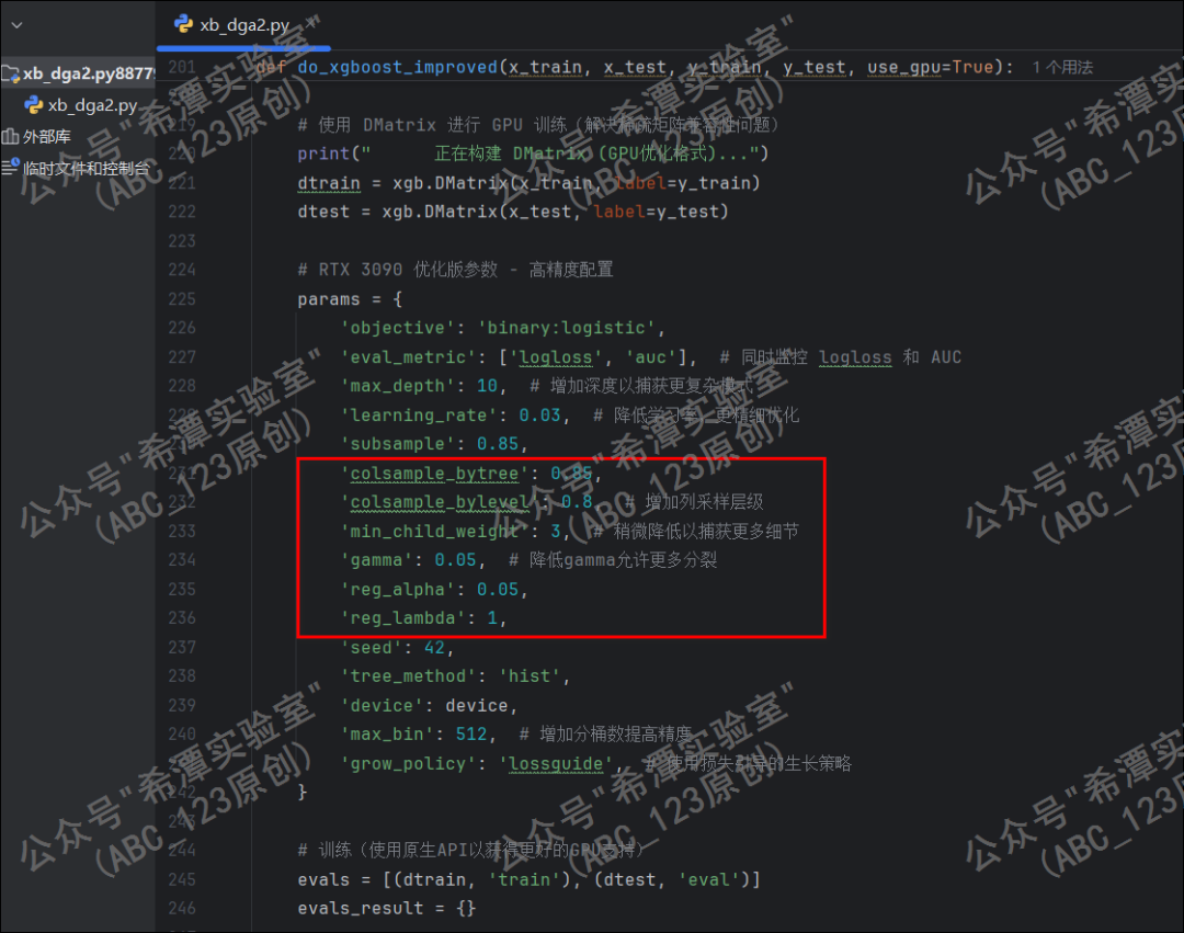 reg_alpha: 0.05 (L1 正则化):它倾向于让不重要的特征权重变为 0,这被称为稀疏性(Sparsity)。当前python代码使用了 N-gram 提取特征,在 GPU 模式下特征维度高达 25,000 维。在这 25,000 个字符片段中,肯定有大量是无用的噪音。设置 reg_alpha: 0.05,虽然数值不大,就是告诉模型:如果觉得某个特征(比如 'zqx')作用很小,那就干脆把它当作不存在,权重设为0。这能帮助模型自动进行特征筛选,去除冗余信息。
