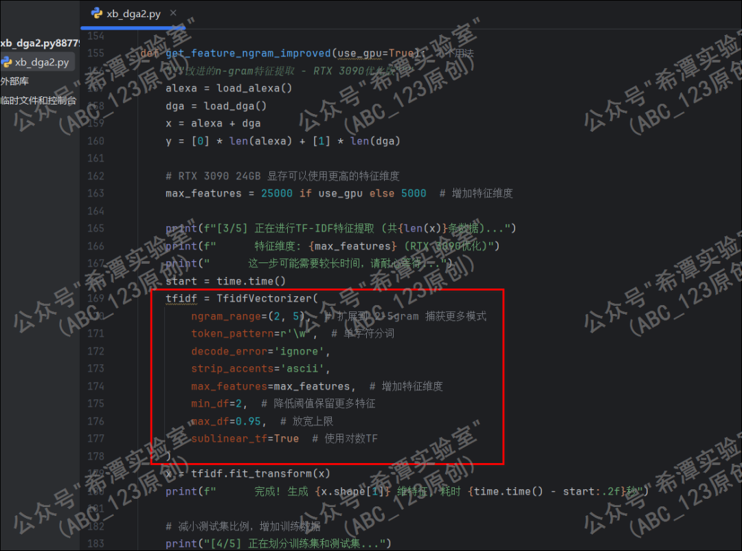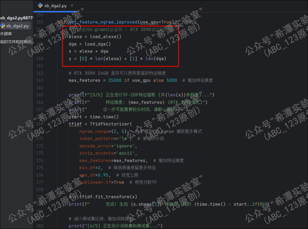 get_feature_ngram_improved 方法是该脚本中核心的特征工程函数,其主要功能是将原始的文本格式域名(如google.com)转换为机器学习模型能够理解的高维数值矩阵。1. 加载数据:调用 load_alexa() 和 load_dga() 分别读取正常域名白名单和恶意域名黑名单。2. 打标签:将正常域名标记为 0,将 DGA 恶意域名标记为 1,并将两者合并为一个总数据集。3. 显存优化:如果 use_gpu=True(检测到显卡),将 max_features(最大特征维度)设置为 25,000;如果仅使用 CPU,则降为 5,000。这意味着在强力硬件支持下,它能保留多达 5 倍的细节特征。