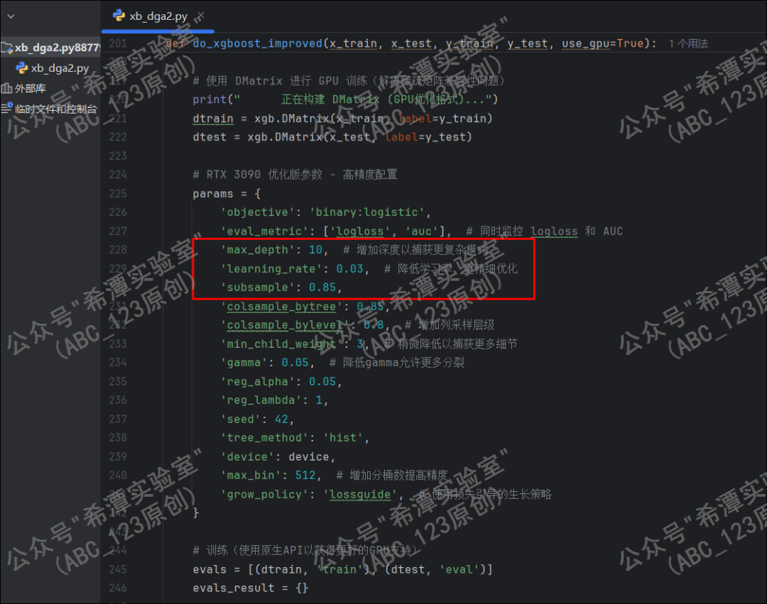 learning_rate: 0.03 指的是学习率(也叫步长),它决定了每一棵新树对最终预测结果的贡献程度,同时也防止过拟合并提升泛化能力。在 XGBoost 这类集成算法中,模型是通过不断添加新的决策树来修正前一棵树的错误的;这意味着每一棵新生成的树,其计算出的权重在加到总模型中时,会被缩减为原来的 3%。这里打个比方,learning_rate设置为0.3, 模型学得很快,几百轮就能拟合数据,单棵树的影响力过大,容易忽略数据中的细微噪声,甚至在最优解附近震荡,无法达到极致的准确率。learning_rate设置为0.03,每棵决策树只贡献0.03的力量,那么单棵树如果学偏了或者钻牛角尖似的生成了过拟合,对整体结果的影响也是有限的。
