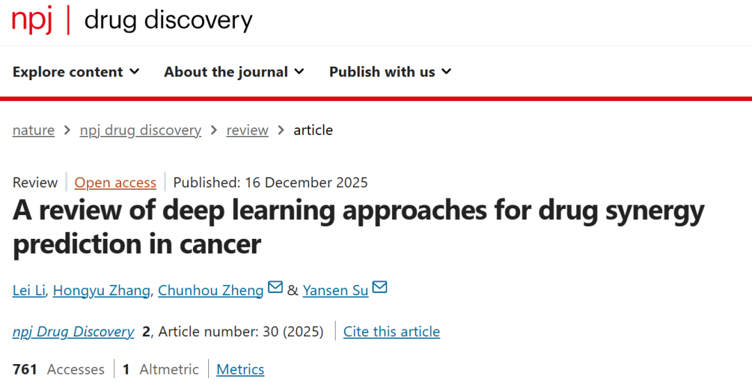 Li, L., Zhang, H., Zheng, C. et al. A review of deep learning approaches for drug synergy prediction in cancer. npj Drug Discov. 2, 30 (2025).