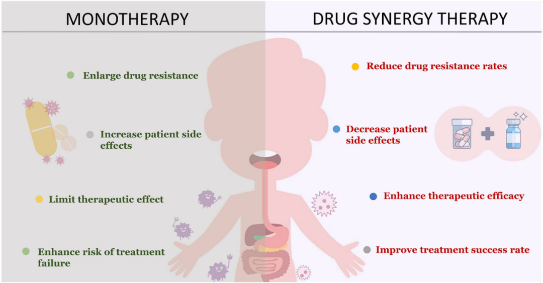 近年来,药物治疗受到越来越多的关注,已成为攻克癌症的重要手段之一。然而,传统的癌症单药治疗存在诸多局限性,例如耐药性增强、患者不良反应增加、治疗效果有限以及治疗失败风险上升。从药理学角度看,药物联合使用可能产生协同、相加或拮抗效应,具体取决于其联合效应是否分别高于、等于或低于各单药的独立效应。其中,协同效应在药物治疗中尤为理想,因为其能够降低耐药发生率、增强治疗效果、减少患者副作用并提高治疗成功率。如图1所示,药物协同治疗能够有效弥补单药治疗的不足。