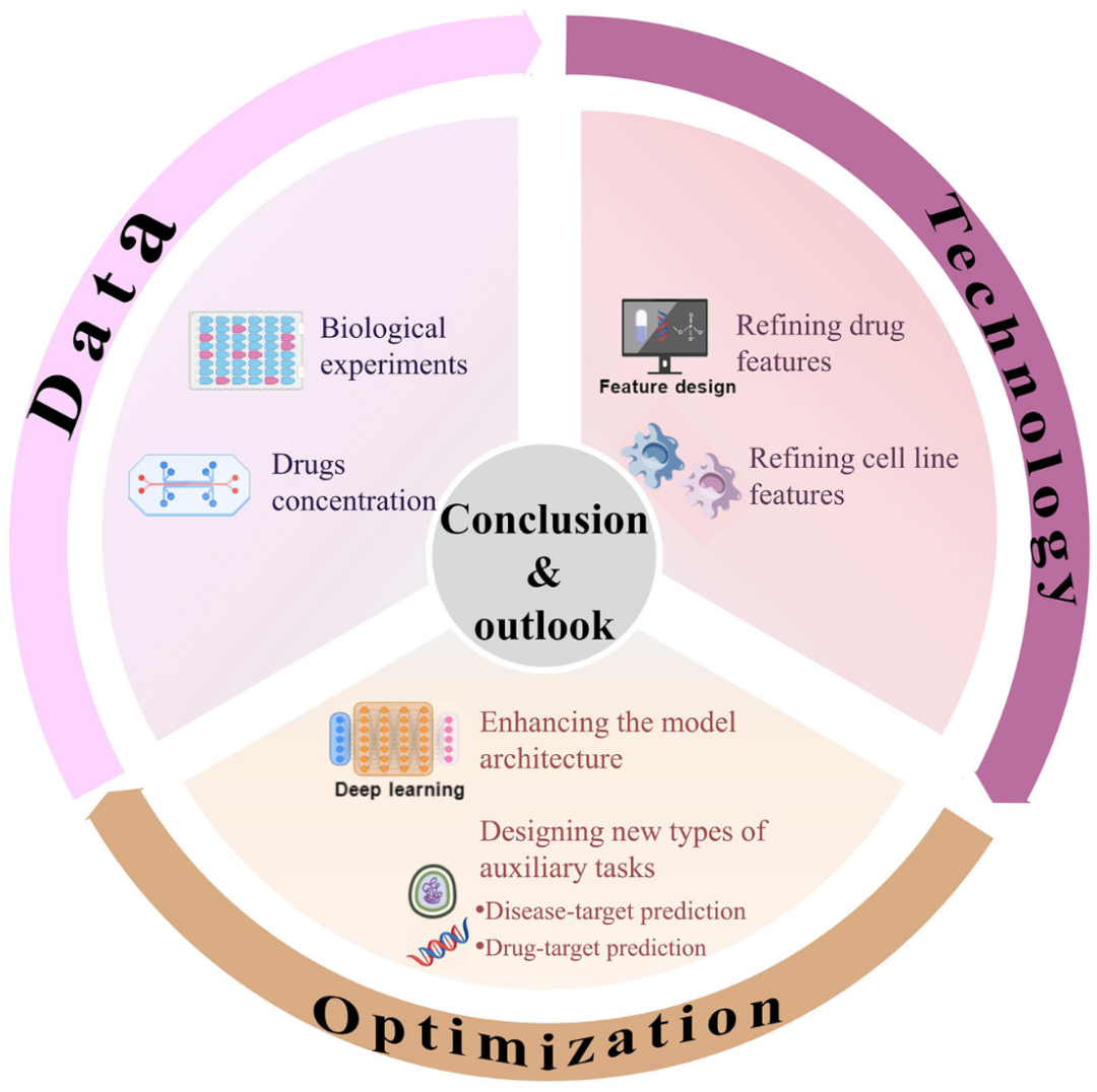 基于深度学习的预测模型在预测药物组合协同效应方面显示出巨大潜力,但在数据、技术和优化方面仍有改进空间,如图6所示。