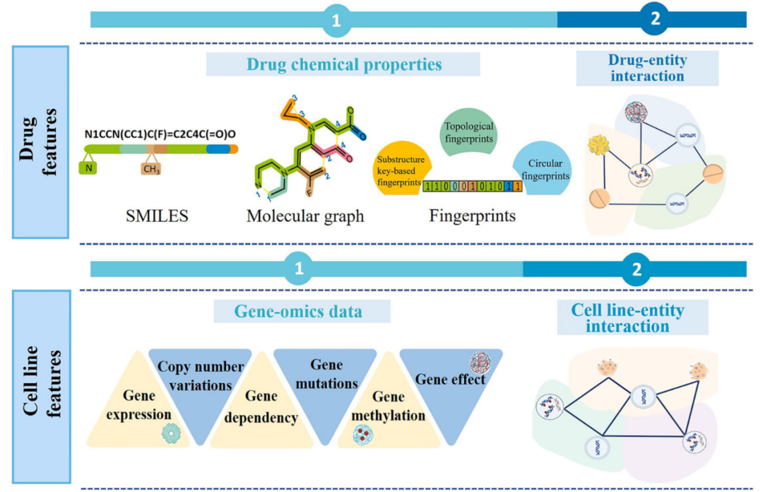 对于细胞系而言,基于深度学习的模型通常采用基因组学和功能组学数据作为输入特征,包括基因表达谱、突变状态、拷贝数变异、DNA甲基化、基因效应评分以及依赖概率等。这些特征能够全面刻画每个细胞系的分子状态和调控程序,为理解其潜在的药物响应提供关键信息。除内在的基因组特征外,细胞系与药物、蛋白质及组织等生物实体之间的相互作用反映了疾病表型背后的多层次调控机制。通过在图结构框架下整合细胞系的分子特征及其基于相互作用的关系,模型不仅能够捕获分子层面的属性,还能学习系统层面的依赖关系,从而提升深度学习模型在药物协同预测中的可解释性和预测性能。