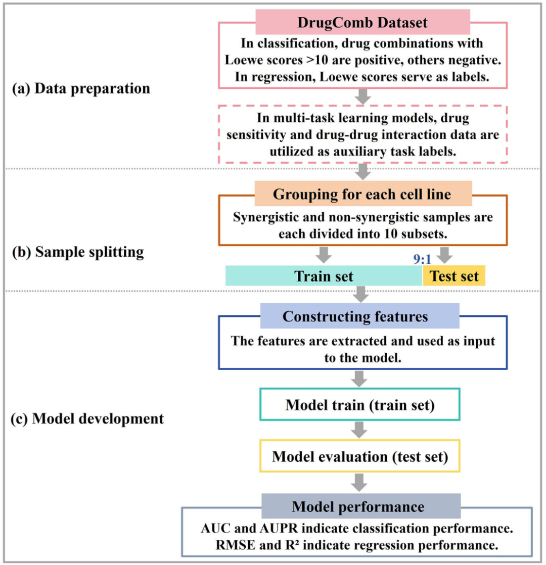 为比较不同类型模型的预测性能,作者选取了若干具有代表性的模型以DrugComb数据集作为数据来源开展对比实验。为直观展示模型比较过程,图5给出了所有模型所遵循的完整流程,包括数据准备、样本划分和模型构建。