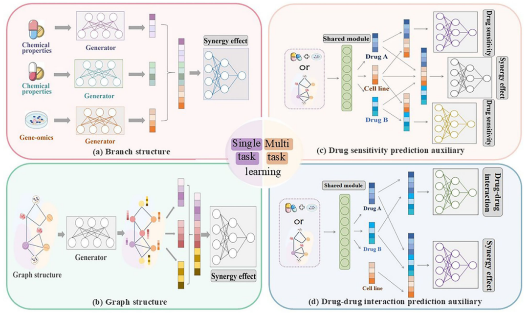 该类方法将单药敏感性预测作为辅助任务,与药物组合协同效应预测进行联合学习。通过共享药物和细胞系的底层表示,该类模型能够同时捕获单药作用机制与联合用药效应之间的内在联系,从而在一定程度上缓解协同数据稀缺带来的训练不稳定问题。