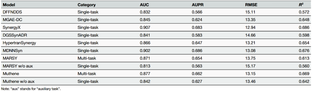 预测模型性能比较结果如表5所示。总的来说,SynergyX和MDNNSyn的优异表现源于其构建高质量特征的能力,而对于多任务学习模型而言,特征质量,尤其是共享特征的质量,同样至关重要。因此,未来的多任务学习模型应进一步提升构建信息更丰富的共享药物或细胞系特征的能力。