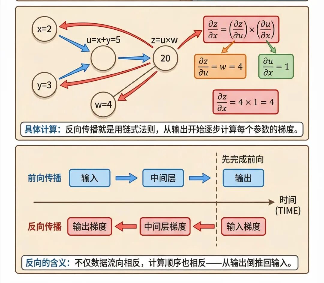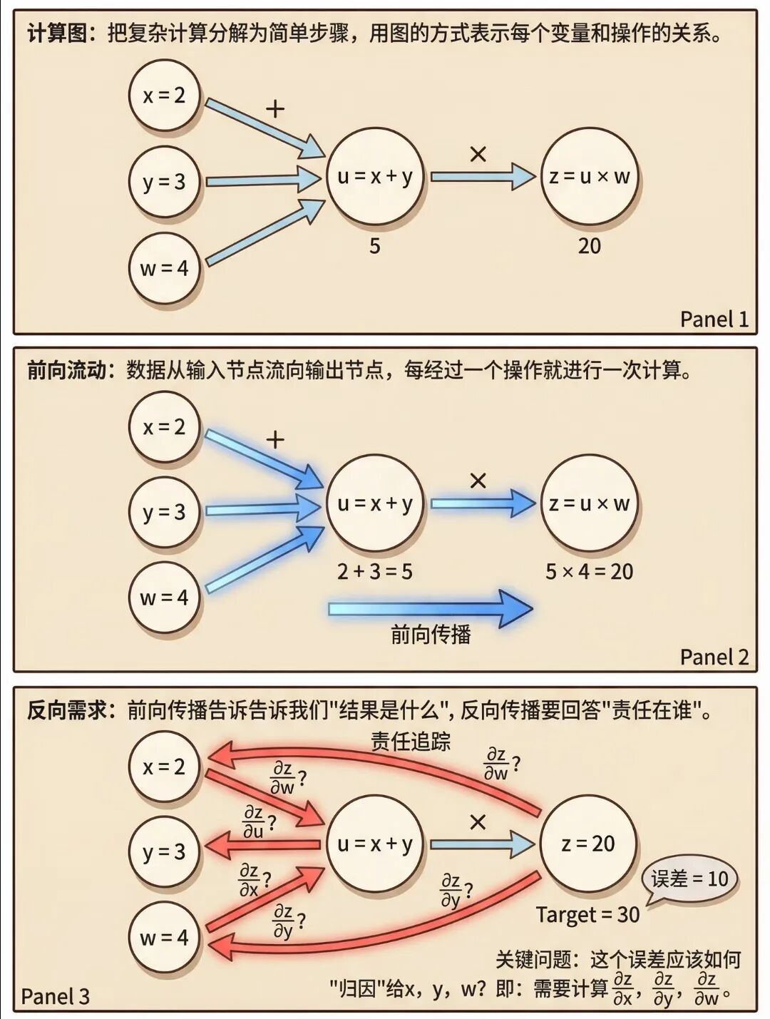 这就像工厂的质量追溯体系:当最终产品出现缺陷时,无需拆解整个生产流程,只需从成品出发,沿着生产线反向排查,每个工序只需确认自己环节的问题,就能快速定位到故障源头。反向传播算法正是这样一套为神经网络量身定制的“质量追溯系统”,让每个参数的“责任”都变得清晰可量化。三、计算图:反向传播的“运作框架”