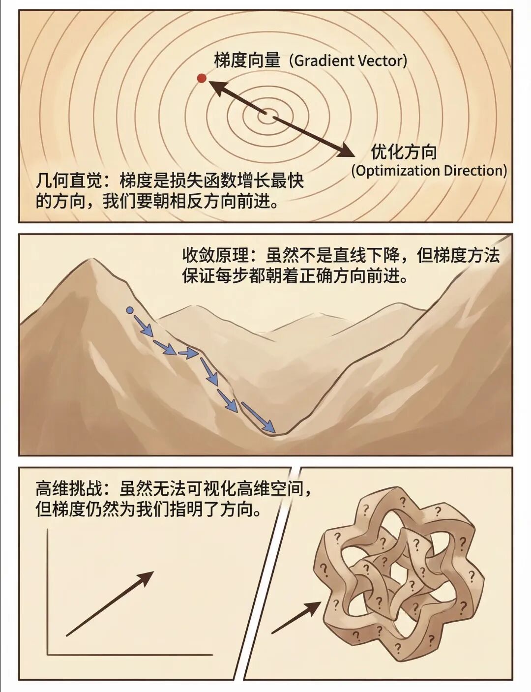 这种“层层传递、局部计算”的模式,让梯度求解的复杂度被严格控制在与前向传播相当的水平,即O(W),其中W为模型的参数量。这一效率上的突破至关重要——它意味着,无论模型有多少层、多少参数,我们都能在可接受的时间内完成梯度计算,而数值微分等传统方法的复杂度则会随着参数量的增加呈指数级增长,根本无法支撑深度模型的训练。