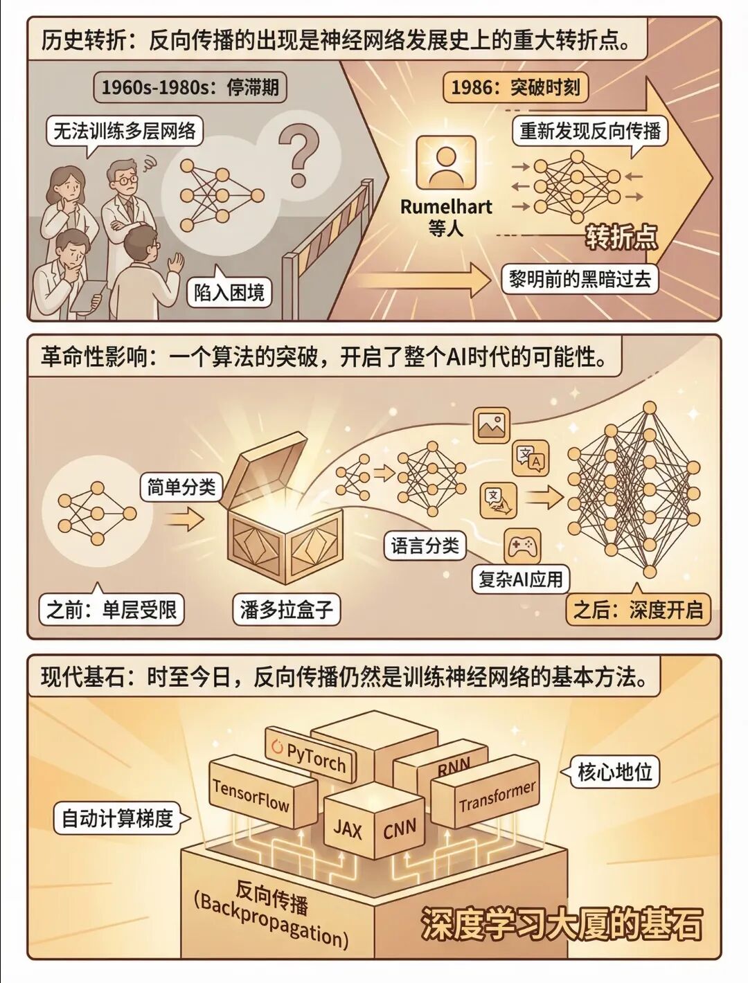 大家好,我是数行天下。在人工智能的璀璨星河中,深度学习无疑是最耀眼的那颗恒星,它让机器具备了从海量数据中自主学习、识别规律甚至创造内容的能力。而支撑这一技术大厦拔地而起的核心基石,正是反向传播(Backpropagation)算法。它的诞生,彻底解决了神经网络训练中的“归因困境”,让深度模型从理论构想变为现实,直接推动了人工智能从低谷走向爆发式增长。