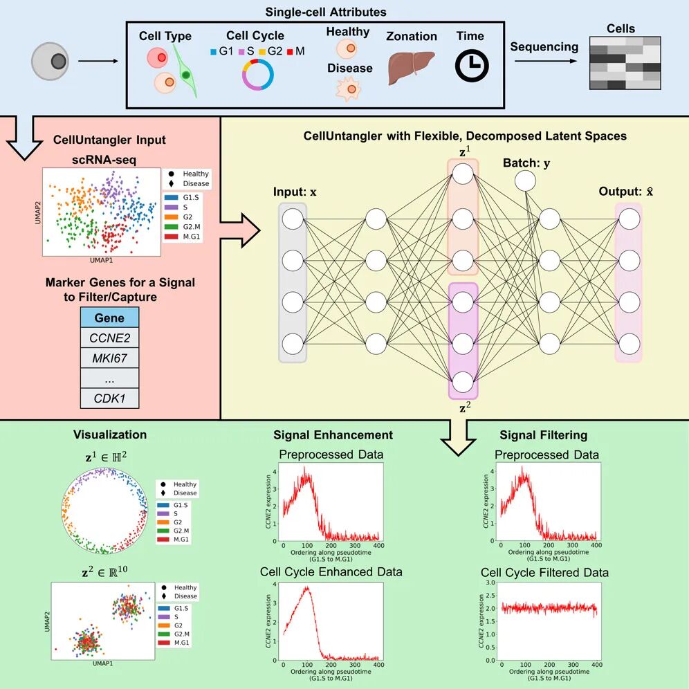 单细胞RNA测序技术近年来风靡全球,推动了细胞类型鉴定、基因调控网络发现以及时空动态过程的深入解析。然而,细胞周期、分化、细胞类型和环境响应等多种生物过程常常在同一细胞内交织发生,导致传统分析方法容易受主导信号干扰,难以揭示真正的生物学本质。CellUntangler正是为解决这一痛点而生。