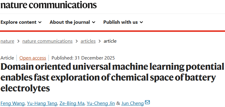 厦大程俊课题组Nat Commun:面向电解液领域的通用机器学习势函数,加速化学空间探索