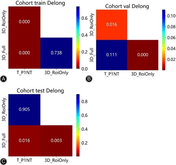Delong检验证实,3D_Full模型的预测性能显著优于仅使用临床特征或3D_RoiOnly的模型(p < 0.05)。