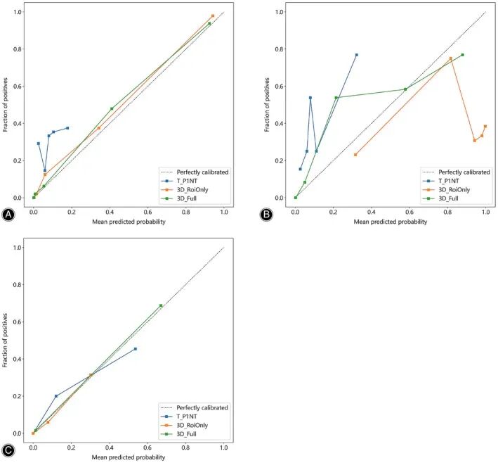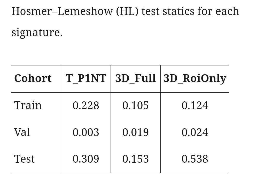 Hosmer-Lemeshow检验显示,3D_Full模型具有最佳的校准性能(HL检验p值>0.05),表明其预测概率与观察结果之间具有最高的一致性。