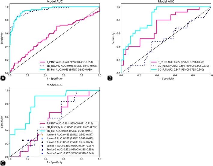 实验表明,包含更多周围三维上下文信息的3D_Full模型其预测性能显著优于仅依赖ROI区域的3D_RoiOnly模型,且最终模型的预测准确性超越了临床医生的判断水平。