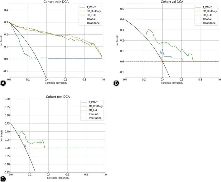 决策曲线分析(DCA)表明,无论是在训练集还是测试集中,本研究的融合模型相比其他特征模型均能提供更高的临床净获益,具有更优的临床应用潜力。