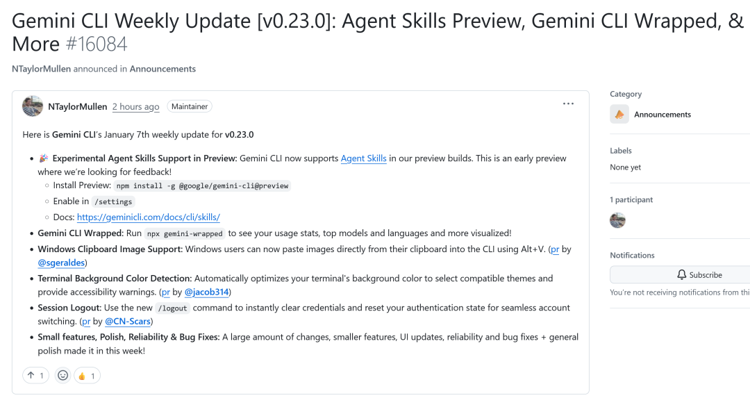 https://openai.com/zh-Hans-CN/index/introducing-chatgpt-health/ Gemini CLI 更新预览版支持 Agent Skills #2 Gemini CLI 发布 v0.23.0 预览版,新增 Agent Skills 支持及 Windows 剪贴板图片粘贴等功能。