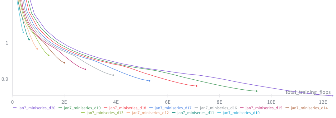 d10 至 d20 模型的训练总成本仅约为 100 美元 ,相关自动化脚本 scaling_laws.sh 和 miniseries.sh 已推送至 master 分支。