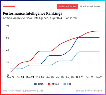 Mistral AI 、 Nvidia 、 智谱 、 Moonshot AI 和 MiniMax 的模型总和。在智能化程度方面,根据 Artificial Analysis 等基准指标, 中国 开源模型在过去一年多时间里一直保持领先。