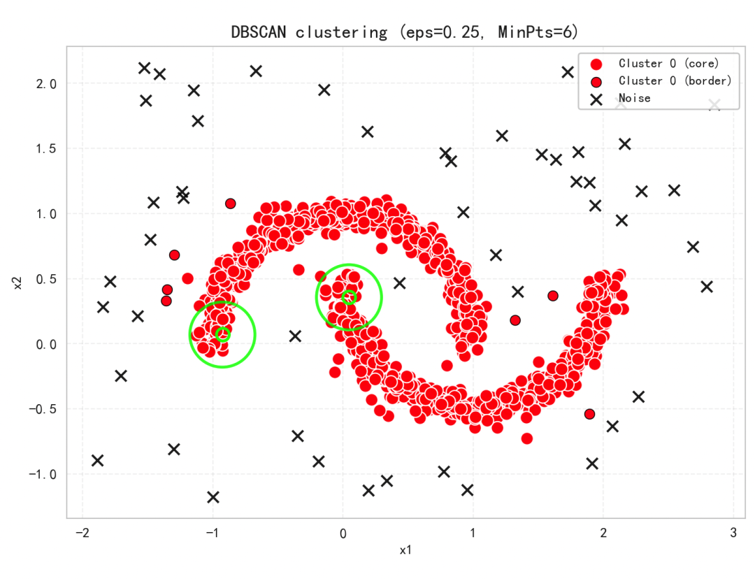 若簇被误分或噪声过多,可适当增大/减小 与 。常用经验是用k-距离图(例如取 )寻找距离拐点,以设定合适的 。