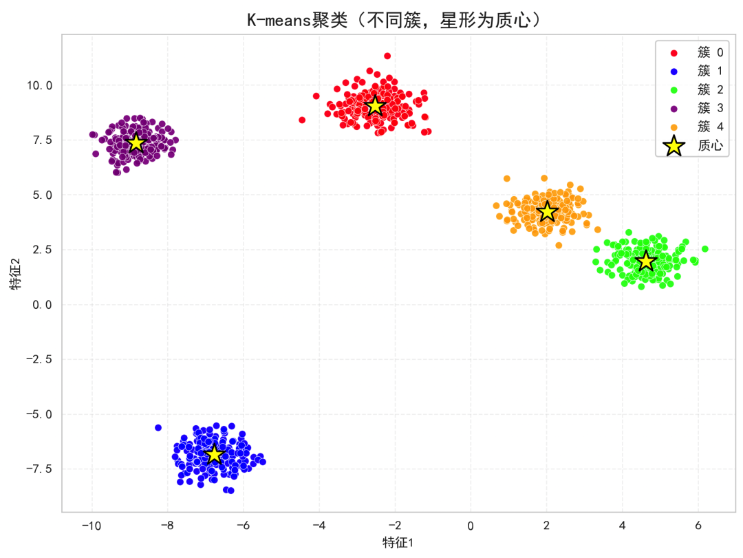 下面的代码用合成数据生成5个簇,使用K-means聚类,并绘制不同簇的散点以及星形质心。
