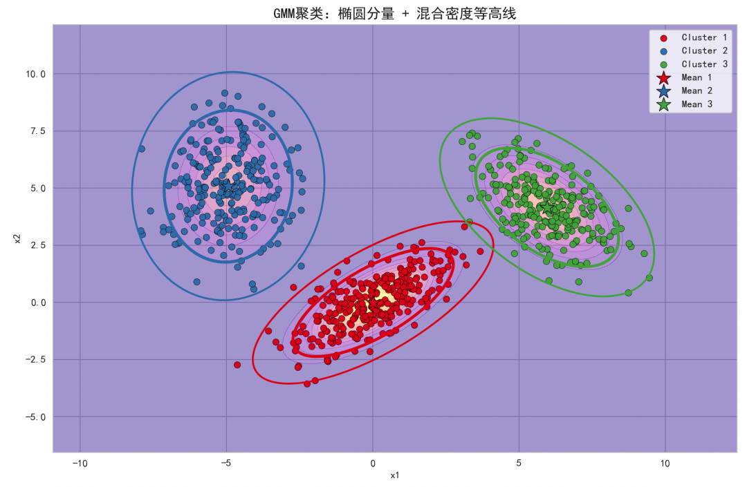 - 每个点的颜色是三个簇基本色的加权混合,权重正是该点对三个簇的隶属度;