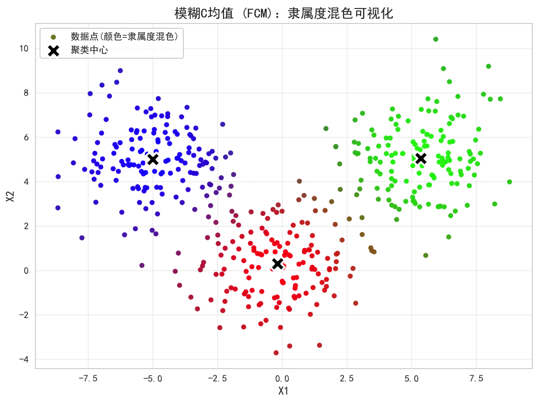 用隶属度加权的颜色混合可视化:每个点的颜色为三个簇基本色(红/绿/蓝)的加权混合,混色越明显说明该点在多个簇都有较高隶属度,体现模糊特性;