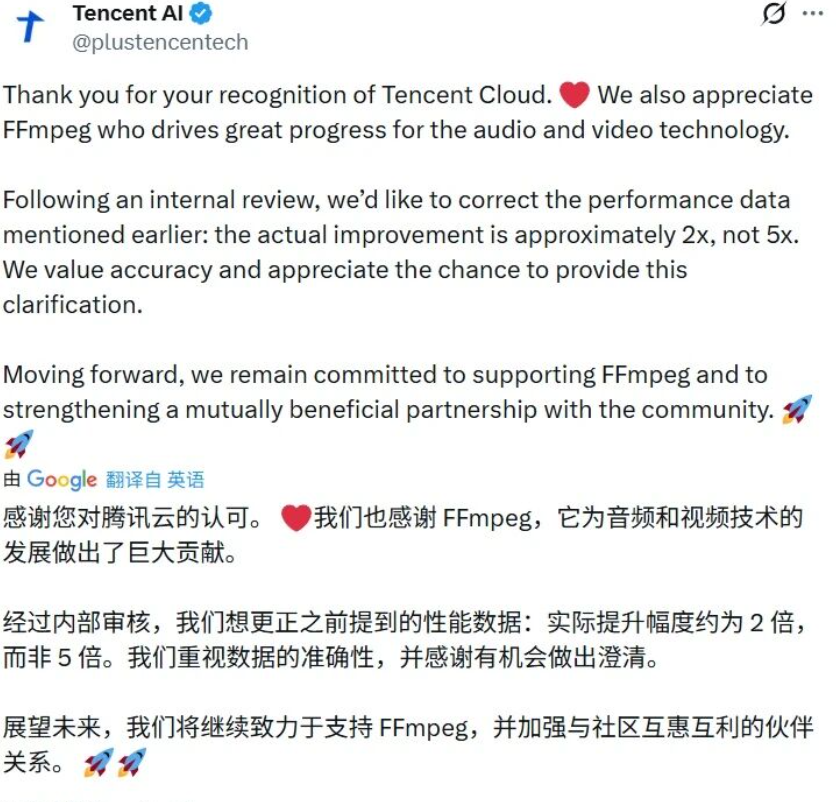 腾讯 AI 官方 1 月 7 日回复称,感谢 FFmpeg 对腾讯云的认可,表示将继续致力于支持 FFmpeg,并加强与社区互惠互利的伙伴关系。