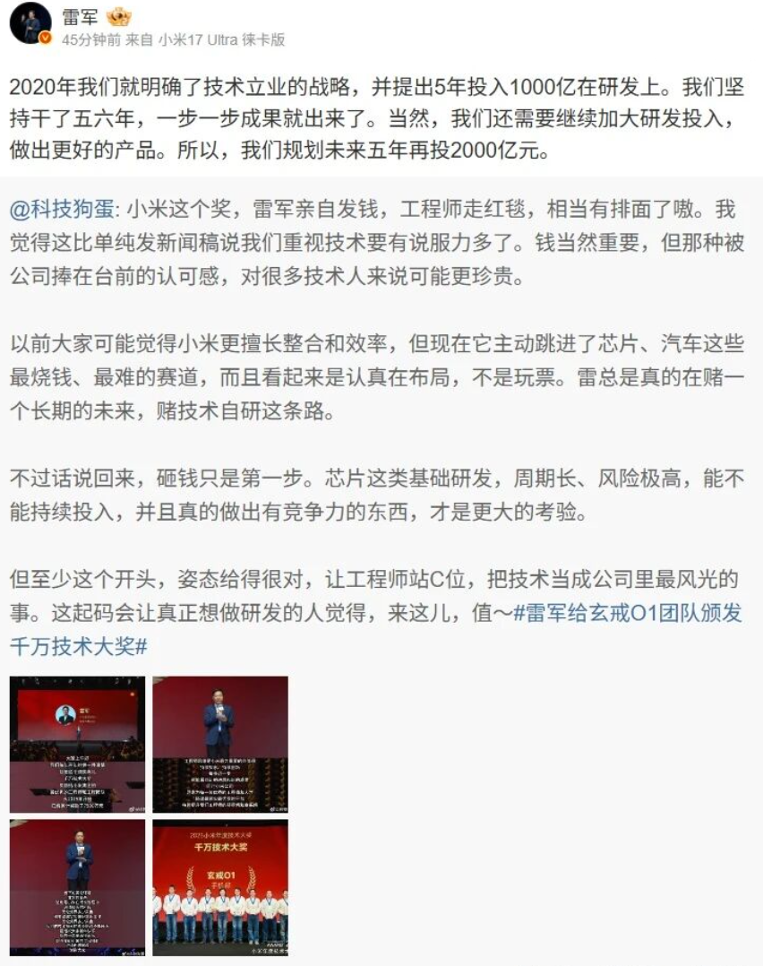 1 月 9 日消息,小米创办人、董事长兼 CEO 雷军近日发文称:“2020 年我们就明确了技术立业的战略,并提出 5 年投入 1000 亿在研发上。我们坚持干了五六年,一步一步成果就出来了。当然,我们还需要继续加大研发投入,做出更好的产品。所以,我们规划未来五年再投 2000 亿元。”