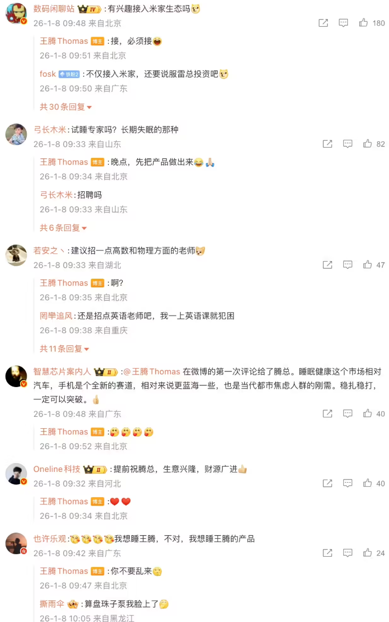 在这条博文评论区内,王腾开启了“快问快答”模式。有网友评论说:“睡觉可以领工资”,王腾回复:“对,我们公司可以随时大小睡”;还有网友询问王腾是否会做保健品,王腾予以否定答复:“没有计划做保健品”;另一网友则宣布自己“已投简历”,王腾则回复说:“前面一百号员工我都会自己聊”。