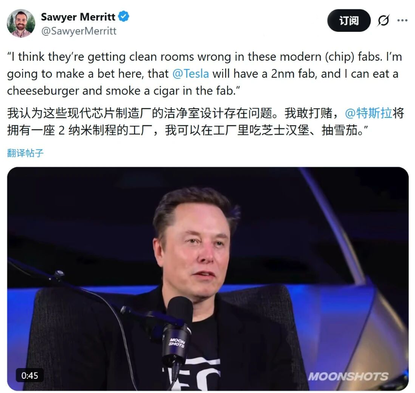 马斯克拟建2nm芯片工厂内可以抽雪茄、吃汉堡