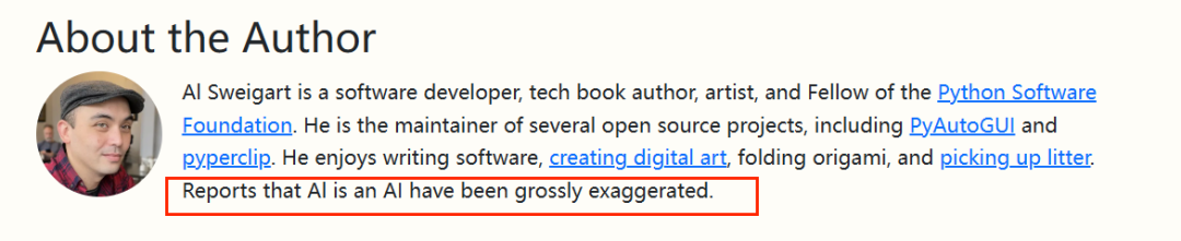 有趣的是,因为产出了太多优质内容,曾有人误以为阿尔·斯维加特是AI(一定程度上也是名字导致的)。对此,他只好在个人网站上无奈澄清:“关于阿尔(AI)是人工智能的说法纯属夸大其词。” 而这份接地气的态度其实也藏着他的教学初心,他不是高高在上的技术大牛,而是真心想推广Python、帮助更多人通过编程受益的引路人。