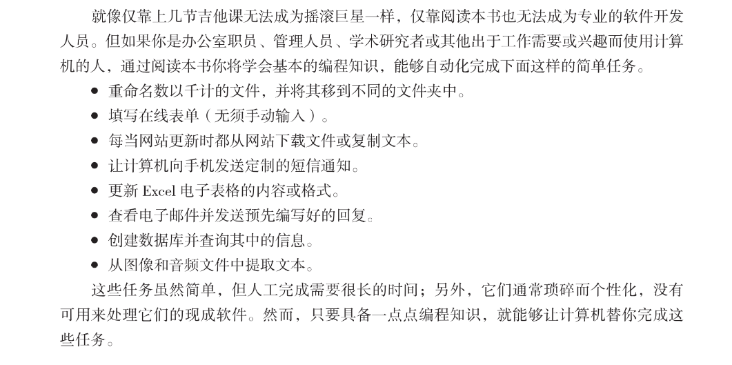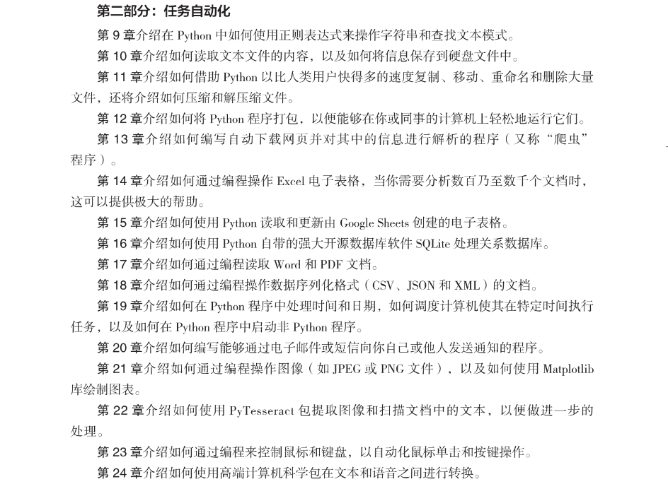 “书中包含如何用 Python 编写程序处理 Excel 表格、爬取网站数据、解析 PDF 与 Word 文档、发送邮件等提升效率的自动化任务,对上班族、科研人员和行政人员来说,都是极具价值的资源。”