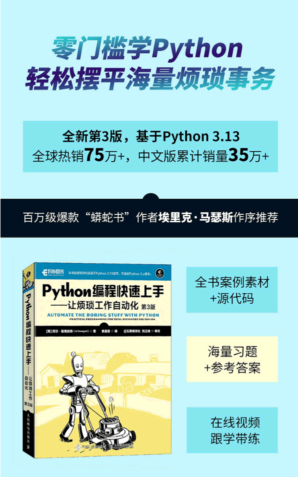 如今,在AI工具逐渐渗透编程领域的新背景下,《Python编程快速上手:让烦琐工作自动化》第3版应势而生,带来了更贴合当下需求的全面升级。