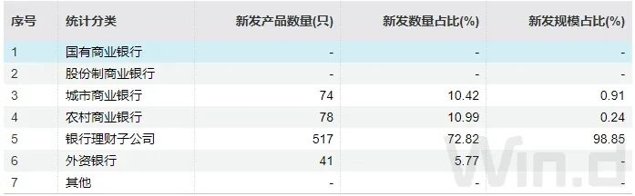 城市商业银行与农村商业银行在发行机构数量上表现活跃,构成银行系产品发行的重要补充力量。城市商业银行有74家参与发行,占比10.42%;农村商业银行有78家参与发行,占比10.99%。
