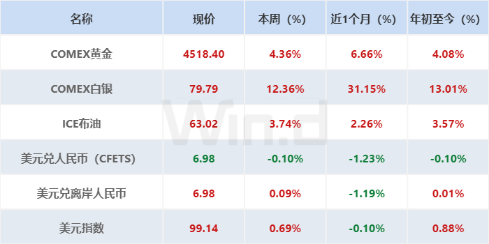 外汇市场方面,美元指数反弹0.69%;人民币对美元汇率小幅波动,美元兑在岸人民币(CFETS)下跌0.10%,美元兑离岸人民币上涨0.09%。
