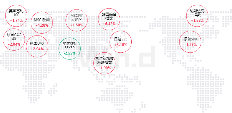 欧洲市场方面:英国富时100指数上涨1.74%,法国CAC40指数上涨2.04%,德国DAX指数上涨2.94%。