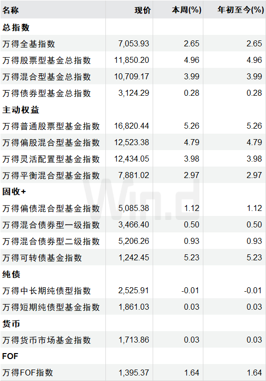 最近一周,万得基金指数整体表现平稳。具体来看:万得全基指数上涨2.65%;万得股票型基金总指数上涨4.96%;万得混合型基金总指数上涨3.99%;万得普通股票型基金指数上涨5.26%;万得偏股混合型基金指数上涨4.79%;万得灵活配置型基金指数上涨3.98%。