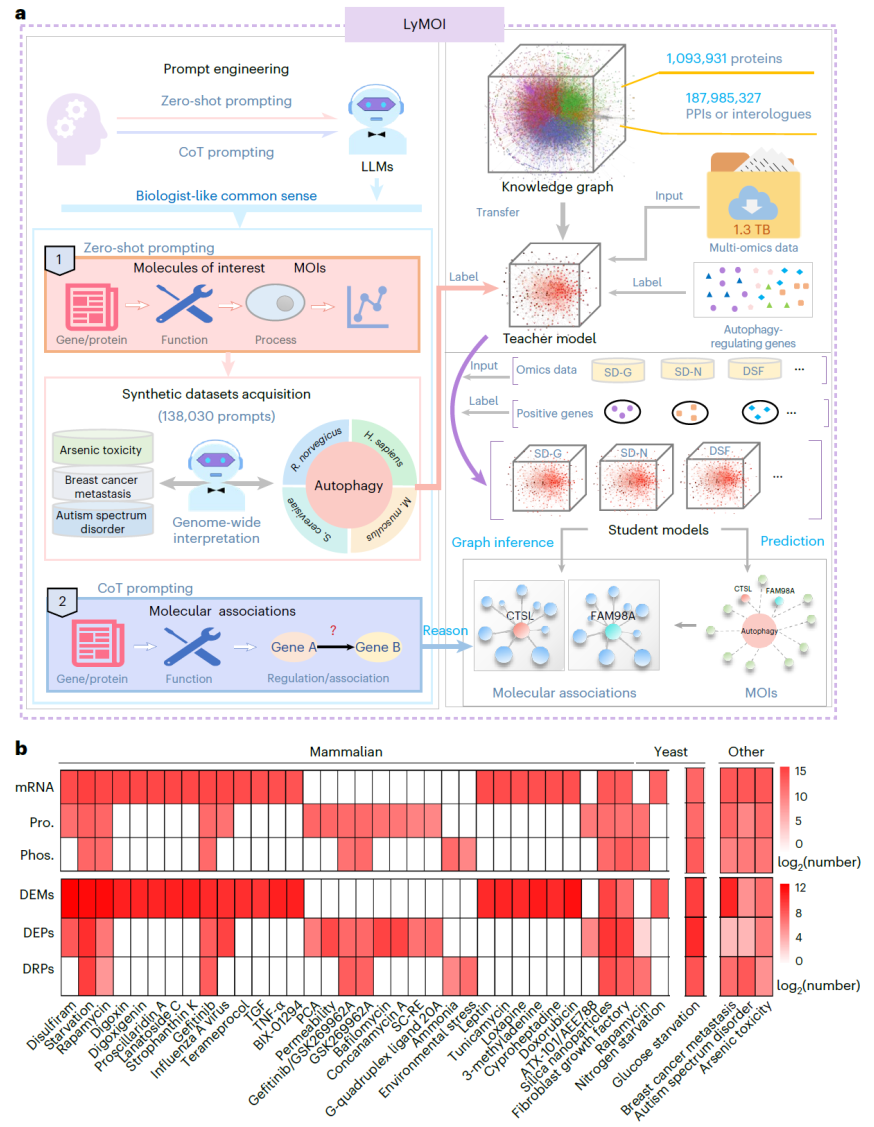 大规模组学数据能够描绘细胞内分子调控的整体图景,但其生物学机制解释仍高度依赖人工经验与实验验证。为解决这一瓶颈,研究人员提出 LyMOI,一种将深度学习与大语言模型(LLM)推理相结合的组学解读混合工作流。LyMOI 通过图神经网络在跨物种蛋白互作知识图谱与多组学数据上进行分层训练,用于预测情境特异性的关键分子;随后,借助大语言模型生成类似研究人员思维链的机制解释,对候选分子的调控作用进行推理。以自噬为核心案例,LyMOI 系统性解析了约 1.3 TB 的转录组、蛋白组与磷酸化组数据,显著扩展了已知自噬调控网络,并在酵母与哺乳动物体系中实验验证了多个新型调控因子。该研究展示了一种将“数据驱动预测”与“知识驱动解释”融合的通用组学解读范式。