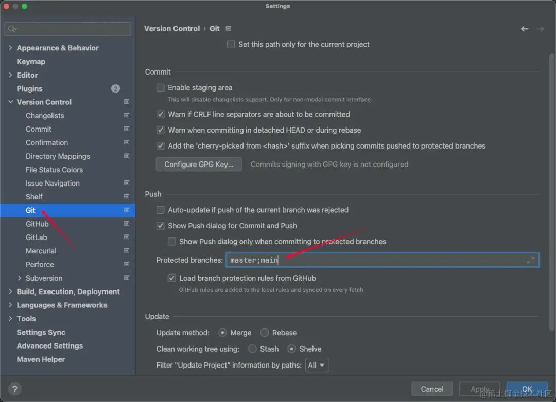 需要注意的是对于一些被保护的分支,这个操作是不能进行的。需要自行查看配置,我这里因为不是master分支,所以没有保护。