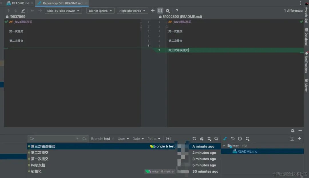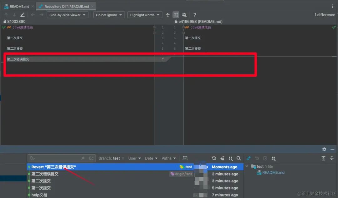 git自动产生一个Revert记录,然后我们会看到git自动将我第三次错误提交代码回退了,这个其实就相当于git帮我们手动回退了代码。