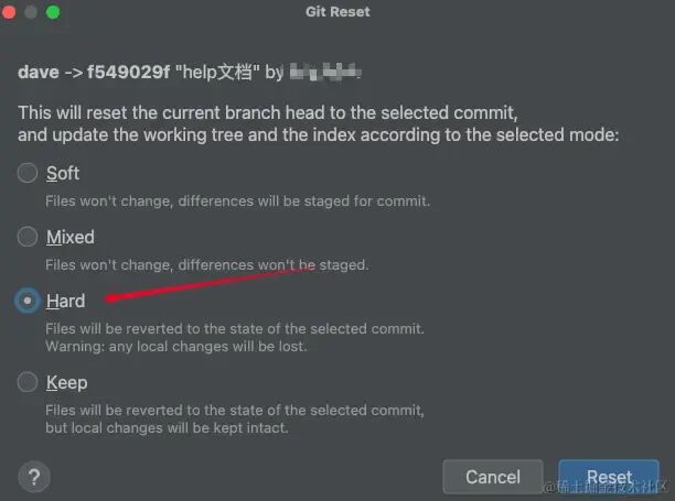 - Hard :文件恢复到所选提交状态,任何更改都会丢失。你已经提交了,然后你又在本地更改了,如果你选hard,那么提交的内容和你提交后又本地修改未提交的内容都会丢失。