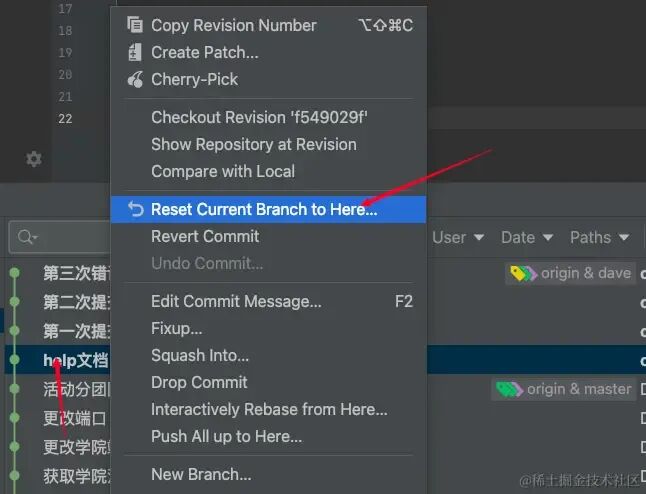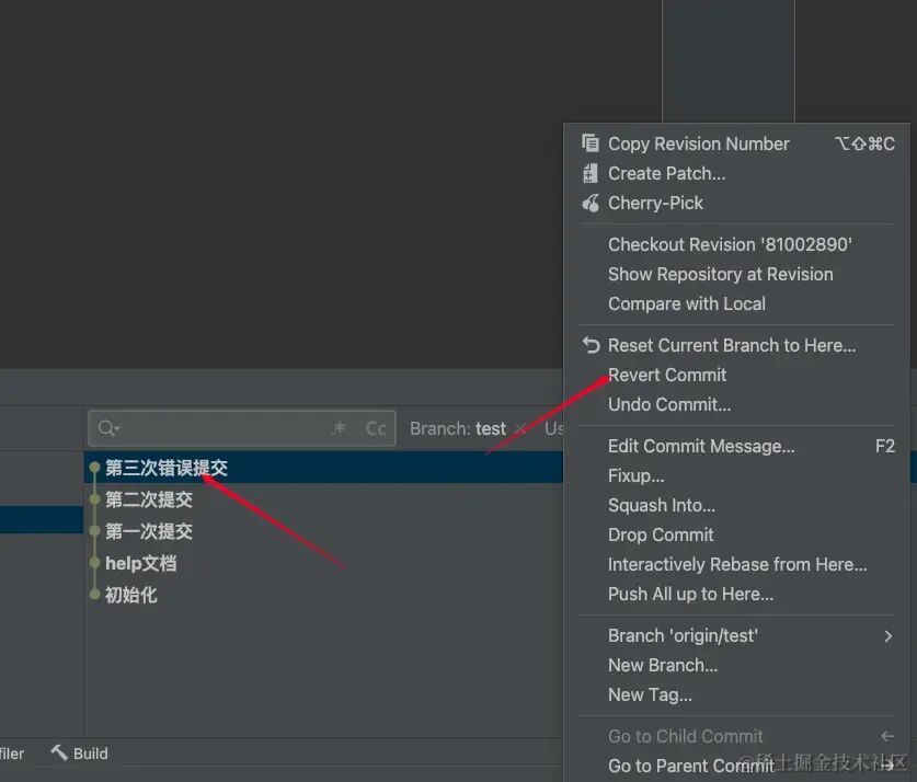 同样的,我第三次提交了错误代码,并且已经push到远程分支。想要撤回这部分代码,只需要右键点击错误提交记录