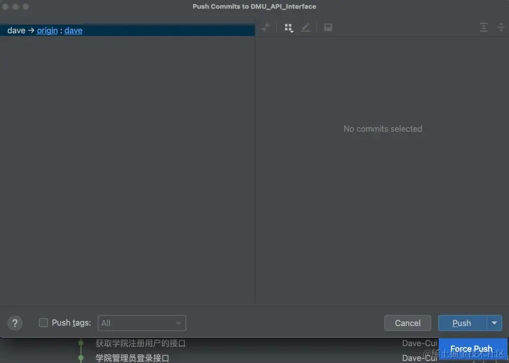 打开push界面,虽然没有commit需要提交,需要点击Force Push ,强推过去。